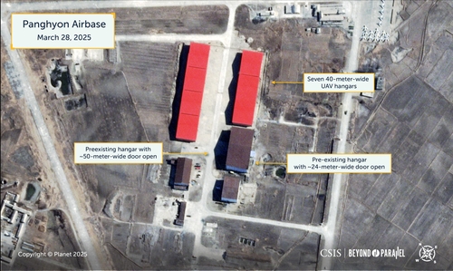 전략국제문제연구소(CSIS)의 북한 전문 매체인 '분단을 넘어'(Beyond Parallel)는 지난주 김정은 북한 국무위원장이 샛별-4급 전략 무인항공기의 변형기종 시험 비행을 참관하기 위해 다녀간 방현 비행장(평안북도 구성시 소재)을 지난달 28일 촬영한 위성이미지를 토대로 발간한 보고서에서 이같이 밝혔다.