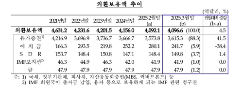외환보유액은 지난해 12월 12억달러 늘었다가 1월(-46억달러)과 2월(-18억달러) 감소했다. 특히 2월에는 4천92억1천만달러를 기록해 4천100억달러 선이 무너지기도 했다.