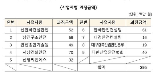 공정거래위원회는 공정거래법 위반 혐의로 대구·경북 지역 9개 건설재해 예방전문 지도기관에 시정명령과 과징금 총 3억9천500만원을 부과하기로 했다고 3일 밝혔다.