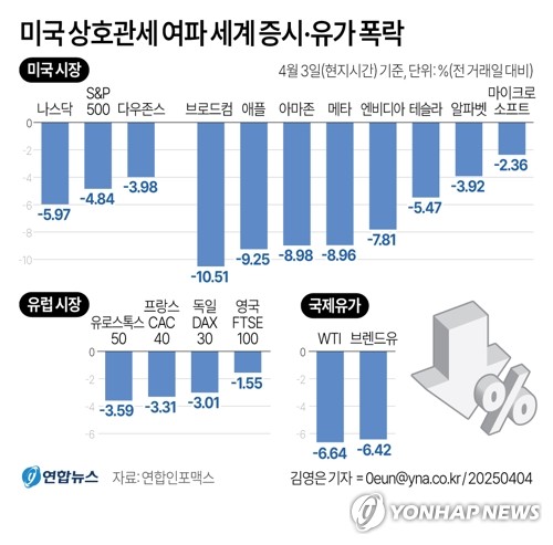 상호관세 부과 발표 다음 날인 이날 뉴욕 증시에서 애플과 엔비디아, 테슬라 등 주요 7개 대형주의 시가총액이 1조 달러(1천452조원) 이상 증발했다.