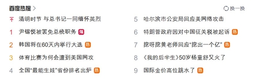 중국 최대 포털 바이두에서는 이날 오전 11시45분 기준으로 '윤석열 파면, 대통령직 상실'이 검색어 1위에 올랐다. 2위는 '한국 60일 이내 대선'이었다.