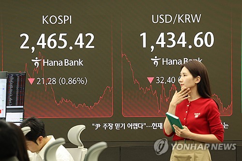 코스피 지수는 이날 전장보다 21.28포인트(0.86%) 내린 2,465.42에 장을 마감했다.
