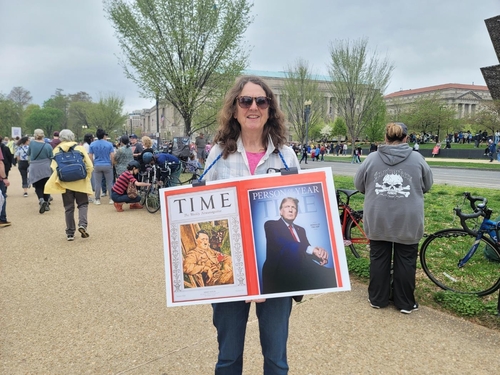 트럼프 대통령(2024년)과 히틀러(1938년)를 각각 '올해의 인물'로 선정한 시사주간 타임지 표지 2개를 나란히 배치한 팻말을 목에 건 그는 "많은 사람이 목소리를 내는 것을 두려워하는데, 그것은 미국 시민으로서 우리의 권리"라며 "우리는 헌법적 권리를 잃을 위험에 처해있다"고 말했다.