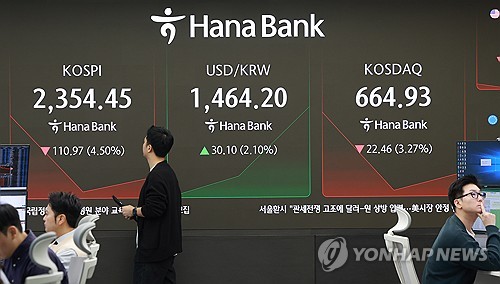 (서울=연합뉴스) 조민정 기자 = 미국발 관세 및 경기 침체 우려에 국내 증시도 7일 100포인트 넘게 밀리며 장중 급락세를 지속하고 있다.