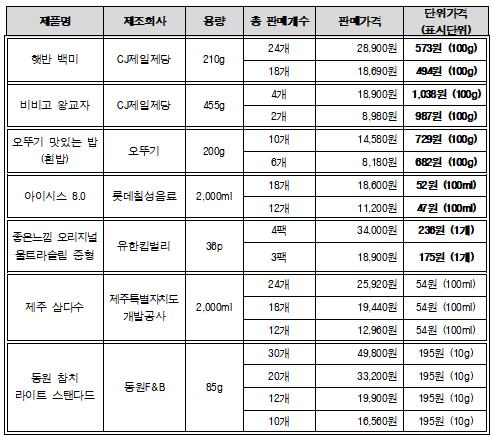 협의회는 네이버쇼핑몰 내 CJ제일제당몰에서 판매하는 비비고 왕교자(455g)와 햇반(210g·백미), 오뚜기몰에서 판매하는 오뚜기맛있는밥(200g·백미) 제품은 구매 개수가 더 많아도 단위가격이 더 비쌌다고 지적했다.