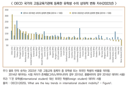 OECD 회원국 내 유학생 수는 2014~2018년 30%의 가파른 증가세에 이어 코로나19 팬데믹에도 2018~2022년 약 18% 증가했다.