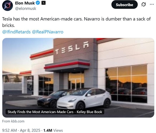 그러면서 "테슬라는 가장 미국산인 차다. 나바로는 벽돌 자루(a sack of bricks)보다도 멍청하다"고 비난했다.