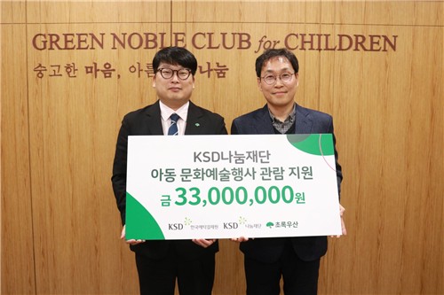 (서울=연합뉴스) 송은경 기자 = 한국예탁결제원 KSD나눔재단은 부산지역 문화소외계층 아동·청소년의 문화예술행사 관람 지원을 위한 후원금 3천300만원을 초록우산 어린이재단 부산지역본부에 기부했다고 9일 밝혔다.