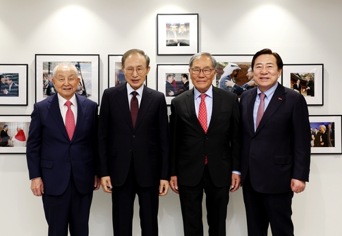 (서울=연합뉴스) 차민지 기자 = 중소기업중앙회는 9일 제23차 세계한인비즈니스대회 대회장을 맡고 있는 김기문 중기중앙회장이 박선근 세계한인비즈니스대회 명예대회장(한미우호협회장), 김장환 세계한인비즈니스대회 고문(극동방송 이사장) 등과 함께 이명박 전 대통령을 예방했다고 밝혔다.
