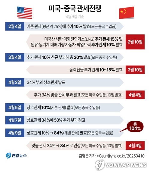 (베이징·서울=연합뉴스) 정성조 특파원 이봉석 기자 = 도널드 트럼프 미국 대통령이 중국에 추가 104%의 관세 폭탄을 위협하자 중국도 9일 즉각 '전방위 보복'에 나섰다.