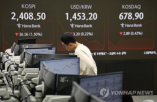 지수는 전장보다 44.32포인트(1.81%) 내린 2,400.74로 거래를 시작한 뒤 1.5% 내외의 하락세를 이어가고 있다.