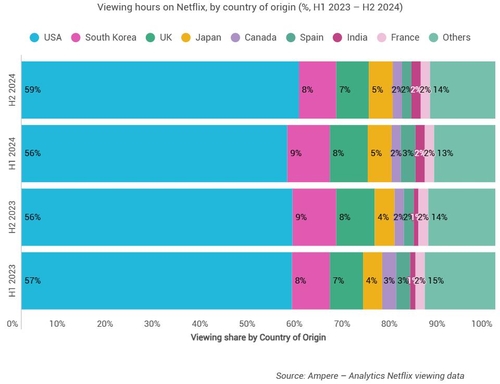 넷플릭스의 시청 데이터를 바탕으로 암페어가 분석한 결과에 따르면 한국 콘텐츠는 2023년 이래 넷플릭스 전체 시청 시간에서 미국 콘텐츠(56∼59%)에 이어 2위로, 8∼9%의 점유율을 기록하고 있다.