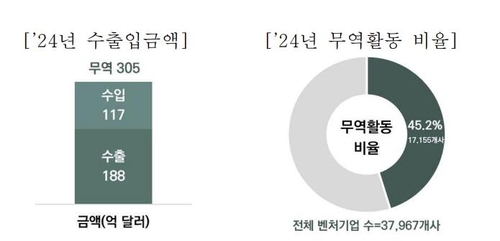 벤처기업협회가 23일 발표한 '2024년 벤처기업 무역 동향'에 따르면 지난해 벤처기업 3만7천967개 중 수출 또는 수입 실적이 있는 무역기업은 1만7천155개로 전체의 45.2%를 차지했다.