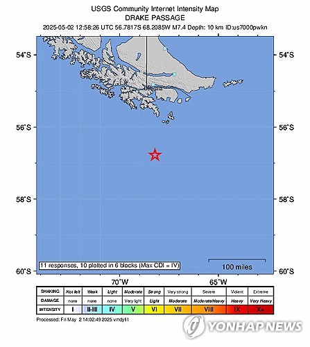 미국 지질조사국(USGS)은 이날 오전 8시 58분 26초께(칠레 현지시각) 남미 최남단 케이프혼과 남극 사이 드레이크 해협 부근에서 규모 7.4 지진이 관측됐다고 밝혔다.