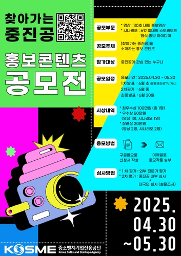 ▲ 중소벤처기업진흥공단은 '찾아가는 중진공' 홍보 콘텐츠 공모전을 개최한다고 7일 밝혔다. 찾아가는 중진공은 중진공 임직원이 중소벤처기업 산업 현장을 직접 방문해 애로사항을 파악하고 맞춤형 정책지원 서비스를 제공하는 양방향 현장 소통 프로그램이다. 공모 분야는 '30초 이내 홍보 영상'과 '6컷 이내 스토리보드 형식의 시나리오' 2개 부문이다. 상금은 300만원으로 최우수상 100만원(1편), 우수상 50만원(2편), 장려상 20만원(4편)이다. 신청 기간은 오는 30일까지다. (서울=연합뉴스)