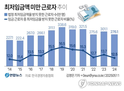 한국경영자총협회(경총)가 11일 통계청 원자료를 분석해 발표한 '2024년 최저임금 미만율 분석'에 따르면 작년 법정 최저임금액(시급 9천860원)을 받지 못한 근로자는 276만1천명으로 집계됐다. 이는 전년 대비 25만명 감소한 수치다.