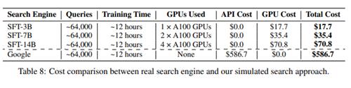 특히 구글 검색 API를 활용해 6만4천건의 질의를 처리하려면 586.7달러(약 82만1천원)의 비용이 들지만, 엔비디아의 A100 그래픽처리장치(GPU) 4개로 구성된 14B 모델에서 훈련하는 비용은 70.8달러로 88%의 비용 절감 효과를 얻을 수 있다고 강조했다.