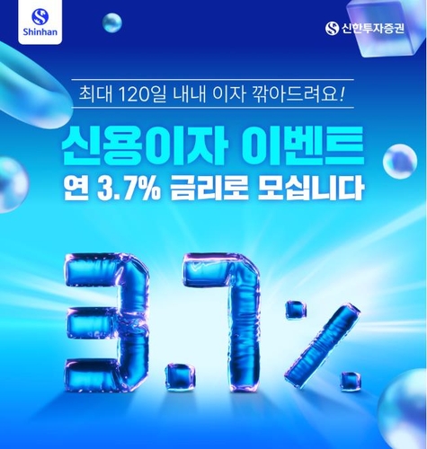(서울=연합뉴스) 조민정 기자 = 신한투자증권은 오는 9월 9일까지 신용이자 연 3.7% 이벤트를 실시한다고 14일 밝혔다.
