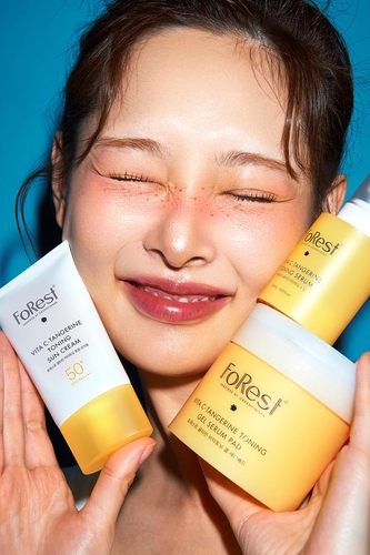 ▲ 유한킴벌리의 화장품 브랜드 포레스트는 '귤타민 비타토닝' 3종을 무신사에 단독 출시하고 일본 시장에도 선보였다. 제주 귤 추출물과 비타민 유래 성분으로 세럼과 겔 세럼패드, 톤업 선크림으로 구성됐다.