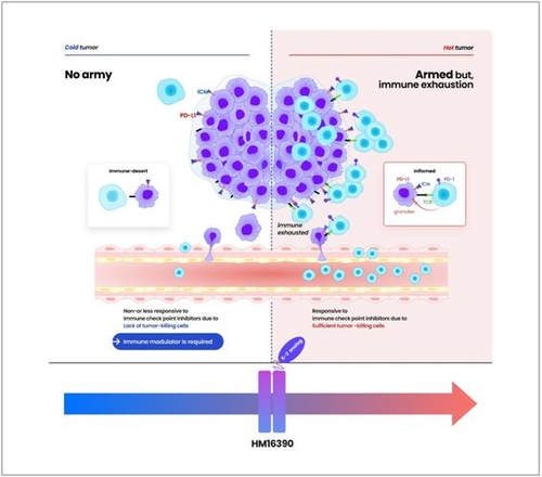 HM16390은 면역세포의 분화와 증식을 조절하는 'IL-2(인터루킨-2)'를 차별화된 전략으로 새롭게 디자인한 차세대 IL-2 변이체다. T 세포의 증식 및 활성화를 유도하는 기전으로, 종양미세환경에서 면역관문억제제에 반응하는 종양침윤림프구(TIL)의 수를 증가시켜 면역원성이 낮은 '콜드 튜머'(cold tumor)를 면역원성이 높은 '핫 튜머'(hot tumor)로 전환, 항종양 효과를 극대화하도록 설계됐다.