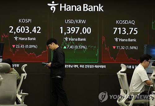 코스피는 전 거래일보다 23.45포인트(0.89%) 내린 2,603.42로 장을 마쳤다. 장중 2,600선을 하향 이탈하기도 했다. 코스닥은 1.5% 넘게 내렸다.
