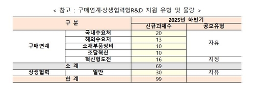 (서울=연합뉴스) 강애란 기자 = 중소벤처기업부는 중소벤처기업의 기술 사업화를 촉진하기 위해 '2025년 구매연계·상생협력형 연구개발(R&D)' 신규과제를 모집한다고 22일 밝혔다.