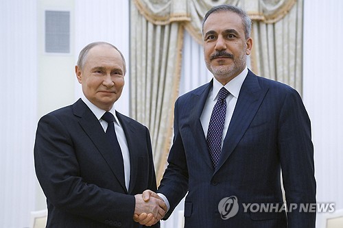 (모스크바=연합뉴스) 최인영 특파원 = 블라디미르 푸틴 러시아 대통령이 26일(현지시간) 하칸 피단 튀르키예 외무장관과 우크라이나 상황을 논의했다.
