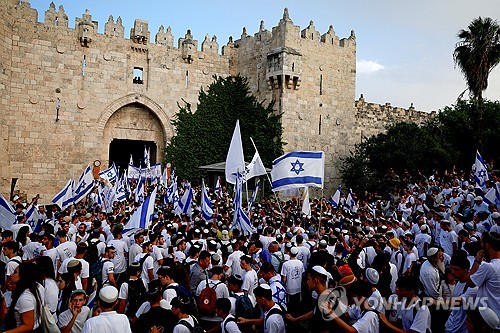 (서울=연합뉴스) 임지우 기자 = 26일(현지시간) 이스라엘이 동예루살렘을 점령했다고 주장하는 '예루살렘의 날'을 맞아 이스라엘 극우 시위대 수천 명이 예루살렘 구시가지에서 행진을 벌였다고 로이터 통신, 영국 일간 가디언 등 외신들이 보도했다.