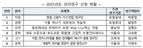 국내 최고 수준 기초연구자를 지원하는 리더연구에는 정밀 고분자 자기조립(포항공대 박문정 교수), 식물 에너지 네트워크 재설계(포항공대 황일두 교수), 항생제 내성 박테리아 모방 리보핵산(RNA) 나노백신 개발(영남대 김종오 교수) 등 6명이 선정됐다.