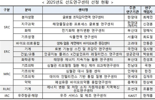 이학 분야는 한양대 '글로벌 조직감각면역 연구센터' 등 4개가, 공학 분야는 고려대 '생체·얼음 계면제어 바이오보존 증강센터' 등 4개가 선정됐다.