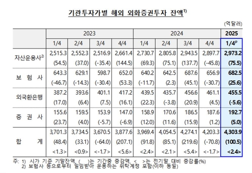 (서울=연합뉴스) 신호경 기자 = 올해 1분기(1∼3월) 국내 기관투자가의 해외 외화증권 투자 잔액이 100억달러 이상 늘었다.