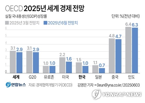 (세종=연합뉴스) 이대희 기자 = 경제협력개발기구(OECD)가 한국의 올해 경제성장률 전망치를 1.0%로 석 달 만에 0.5%포인트(p) 내렸다.
