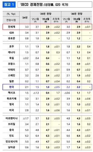 OECD의 한국 성장 전망치 하향 폭은 G20 회원국 중 미국(2.2→1.6%, -0.6%p) 다음으로 크다. 일본(1.1→0.7%, -0.4%p)도 하락 폭이 큰 편이었다.