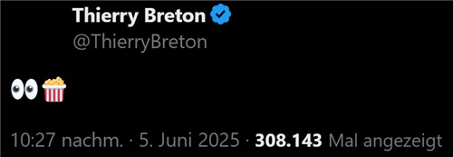 티에리 브르통 전 유럽연합(EU) 내수담당 집행위원은 트럼프 대통령과 머스크의 설전이 소셜미디어를 통해 종일 생중계된 5일 밤(현지시간) 엑스(X·옛 트위터)에 동그랗게 뜬 두 눈과 팝콘 이모티콘을 나란히 올렸다.