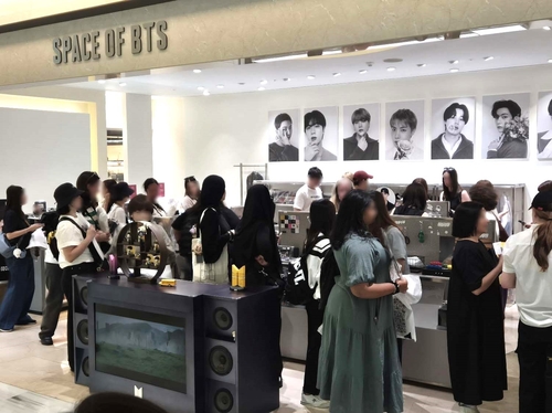 (서울=연합뉴스) 전성훈 기자 = 신세계면세점은 방탄소년단(BTS)의 완전체 복귀를 앞두고 자사 BTS 공식 상품 매장인 '스페이스 오브 BTS'(SPACE OF BTS)에 외국인 관광객과 글로벌 팬들의 발길이 이어지고 있다고 12일 밝혔다.