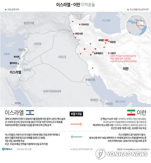 (서울=연합뉴스) 임지우 기자 = 이스라엘이 이란의 핵시설과 군 수뇌부를 폭격한 뒤 양국의 교전이 이틀째 격렬하게 지속됐다.
