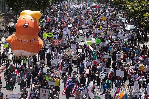 (샌프란시스코=연합뉴스) 김태종 특파원 = 도널드 트럼프 미국 대통령의 79번째 생일인 14일(현지시간) 미국이 두 쪽으로 갈라섰다.