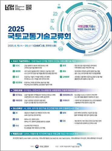 (세종=연합뉴스) 임기창 기자 = 국토교통부는 국토교통 기술 혁신을 위해 각계 전문가가 모이는 '2025 국토교통기술교류회'를 이달 19∼20일 서울 강남구 코엑스에서 개최한다고 17일 밝혔다.