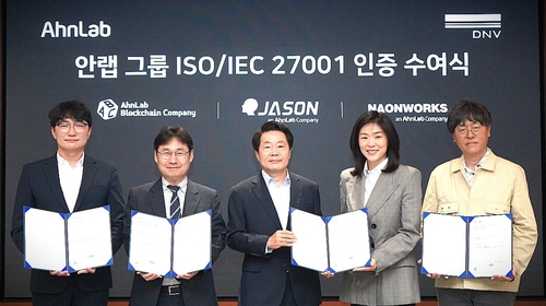 ▲ 안랩[053800]은 24일 국제 표준 정보보호 인증 'ISO 27001'을 자회사 3사와 동시 획득했다고 밝혔다. 안랩은 2008년부터 18년째 해당 인증을 유지해 오고 있으며, 이번에 인증 대상을 자회사까지 확장해 그룹 내 정보 보호 체계를 강화했다고 강조했다. (서울=연합뉴스) (끝)