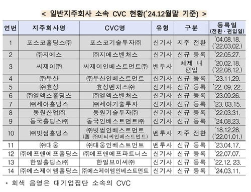 지난해 말 기준 일반 지주회사 소속 CVC는 14개사로 전년보다 1개 증가했다.