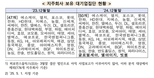 작년 말 기준 지주회사 수는 총 177개로 전년보다 3개 증가했다. 자·손자·증손회사는 2천462개였다. 지주회사 1곳당 평균 14개 소속 회사를 지배했다.