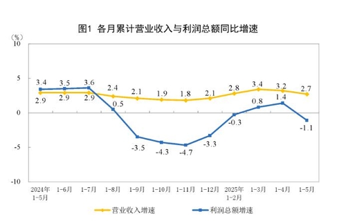 공업 기업의 1∼5월 매출 총액은 작년 동기 대비 2.7% 증가했으며 영업비용 총액은 3.0% 늘었다.