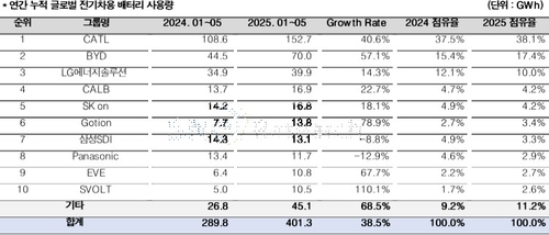 LG에너지솔루션은 배터리 사용량이 39.9GWh로 전년 동기 대비 14.3% 늘며 점유율 12.1%로 3위를 유지했다. SK온은 16.8GWh로 18.1% 증가하면서 점유율 4.9%로 5위에 올랐다.