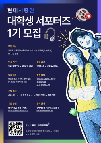 (서울=연합뉴스) 조민정 기자 = 현대차증권[001500]은 청년층과의 소통 강화를 위한 브랜드 캠페인의 일환으로 '대학생 서포터즈 1기'를 모집한다고 7일 밝혔다.