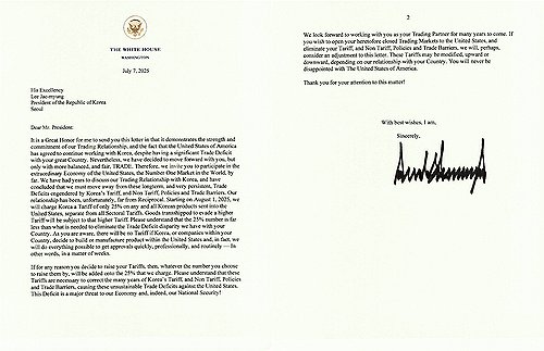 이날 트럼프 대통령은 한국과 일본을 비롯한 14개국에 25∼40%의 국가별 상호관세를 적시한 이른바 '관세 서한'을 보내 이를 8월 1일부터 부과하겠다고 통보했다. 한국에는 지난 4월 2일 부과하겠다고 한 것과 동일한 상호관세 25%를 예고했다.