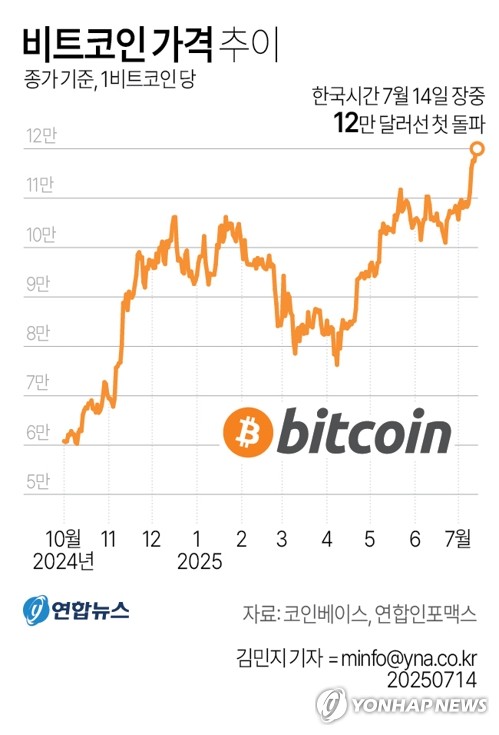 (서울=연합뉴스) 이신영 황정우 기자 = 가상화폐 대장주 비트코인이 14일 사상 최초로 12만달러선을 돌파했다.