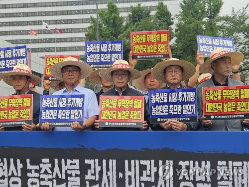 다른 농업인단체인 한국농축산연합회도 이날 성명을 통해 "정부는 매번 농업 강국과 자유무역협정(FTA) 체결 과정에서 농축산업을 상대국에 전면 양보했다"며 "미국의 압력에 굴복한 농축산물 추가 개방은 농민들에게 사실상 사형 선고나 다름없다"고 목소리를 높였다.