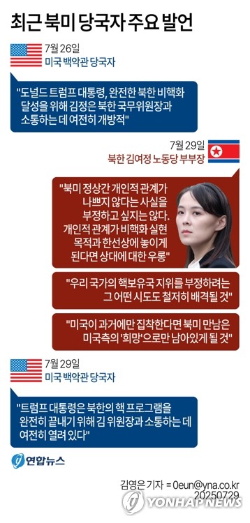 (워싱턴=연합뉴스) 홍정규 특파원 = 미국 정부는 29일(현지시간) 김여정 북한 노동당 부부장의 담화와 관련해 "트럼프 대통령은 전 세계 사람들에게 평화와 번영, 그리고 정상적인 삶을 제공하기 위해 누구와도 대화하려는 의지를 갖고 있다"고 밝혔다.