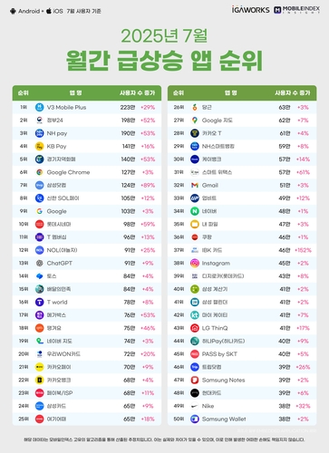 7월 앱 사용량 순위 발표…백신앱 'V3 모바일'도 급등