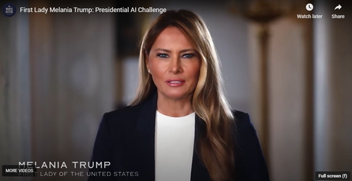 (워싱턴=연합뉴스) 이유미 특파원 = 도널드 트럼프 미국 대통령의 부인 멜라니아 여사가 미 전역의 학생과 교육자들을 대상으로 한 대통령실 주도의 '인공지능(AI) 챌린지' 홍보 대사로 나섰다.